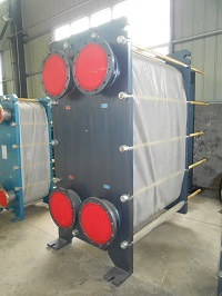 水水換熱器是一組波紋金屬板組成,板上有四個(gè)角孔,供熱交換的兩種液(氣)體通過。金屬板片安裝在一個(gè)側(cè)面有固定板和活動(dòng)壓緊板的框架內(nèi),并用夾緊螺栓夾緊。板片上裝有密封墊片,將流體通道密封,并且引導(dǎo)流體交替地流至各自的通道內(nèi)。波紋板不僅提高了湍流程度,并且形成許多支撐點(diǎn),足以承受介質(zhì)間的壓力差。金屬板和活動(dòng)壓緊板懸掛在上導(dǎo)桿,并由下導(dǎo)桿定位,而桿端則固定在支撐柱上。